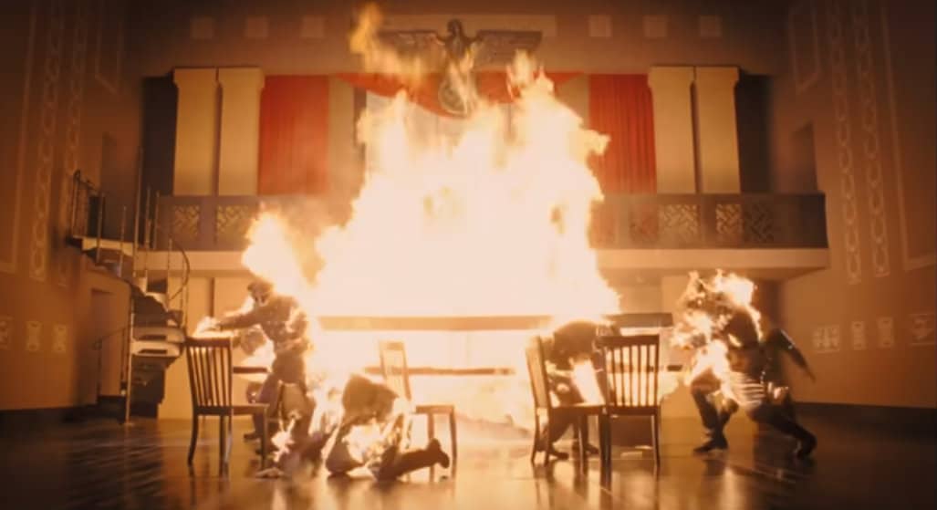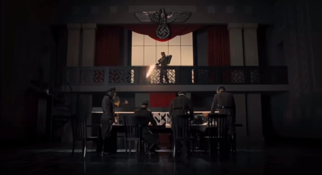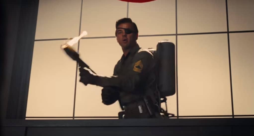 Rick is an action star who plays one-man patriotic killing machines. The trailer shows us some scenes from his movies that wouldn’t seem out of place in Inglorious Basterds. In the above massacre, he asks some Nazi scumbags if they ordered some “fried Sour Puss” before scorching them with a flame thrower. As you can see, DiCaprio is having a blast now that he’s an Oscar winner.