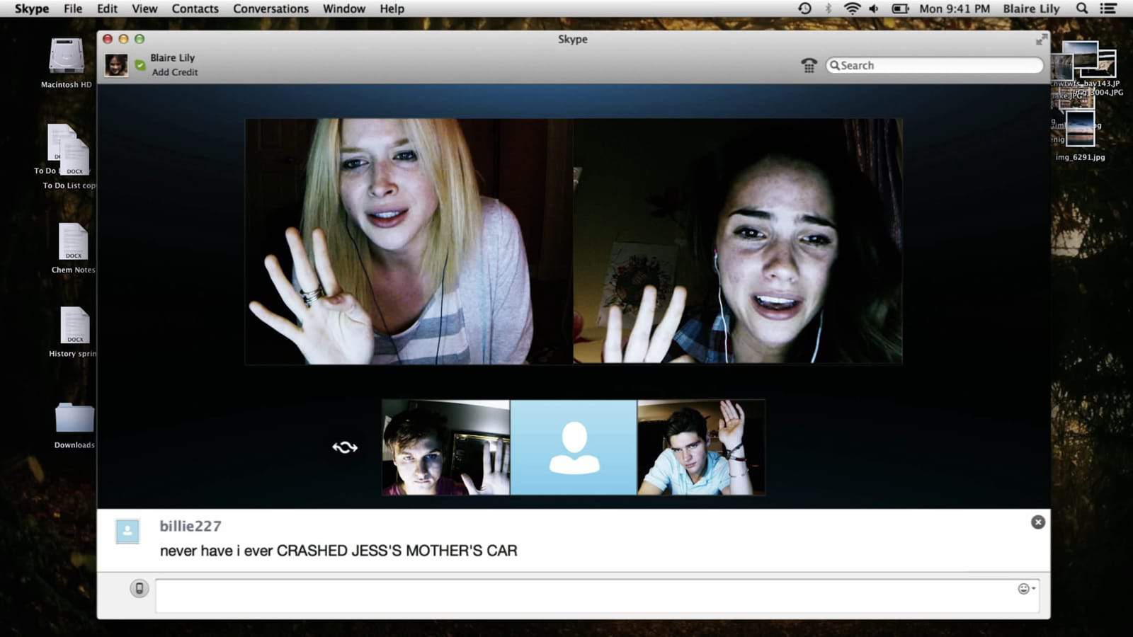 Although the desktop format is unconventional, Gabriadze deftly employs the computer screen to communicate information to the audience in a way that is similar to conventional filmmaking. The Skype conversation shuffles the video feeds from the various participants so at times one or two characters appear larger on the screen because their video feed is displayed more prominently. This allows Gabriadze to emphasize a character’s speech because our attention is inevitably drawn to whoever is featured. In a sense, when one character is featured speaking to a second and then Skype shuffles so that second character is featured, Gabriadze is employing shot/reverse shot editing without the use of a cut.