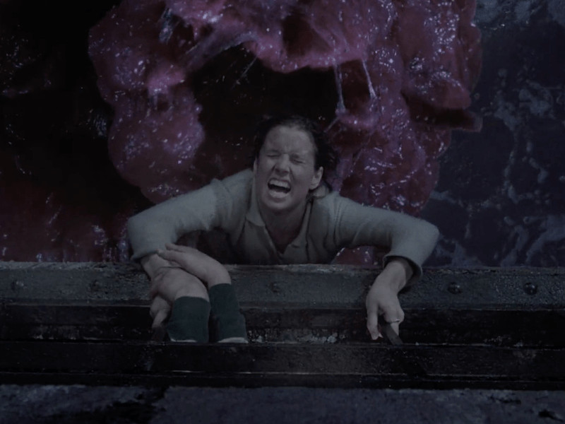 For the effect of Smith pulling Leitch’s undigested arm off, the crew made use of an over-the-shoulder “Blob sled,” which consisted of an arm rig with a quick-release mechanism fitted with a fake appendage. Smith would fight against a crew member with a pistol grip release, providing resistance with the sled. “Then all the tendons would stream out, and she’d go flying!” Gardner recalls. “The take they used was the one where the operator got a little trigger happy and let go before she was expecting it, so her look of surprise was really genuine.”