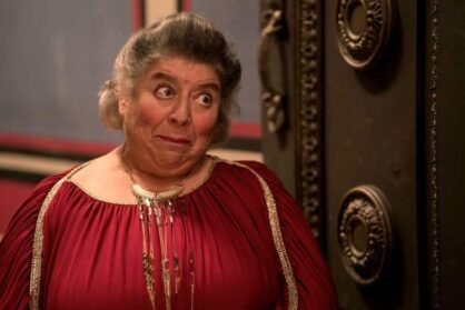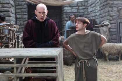 I like to imagine that when you are tasked with casting a British TV show you gain access to a secret UK-comedian summoning Bat-signal. Or maybe there’s a listserv…or some ravens. The prolific Maureen Lipman shows up as Landlady (a coup against Karl Theobald’s very funny Landlord); Danny Dyer of EastEnders fame has a very memorable turn as Cassius, the fatally love-sick gladiator; Simon Callow plays Victor the Gracchi, a bumbling, wig-wearing politician; Tim Key kills it as the psychotic rival slave Mushki; and living legend Miriam Margolyes pops in as a famous playwright. But for my money, the real standout guest spot is that of Alex Macqueen as Brother Quintus, the leader of a, um, intense, religious sect.